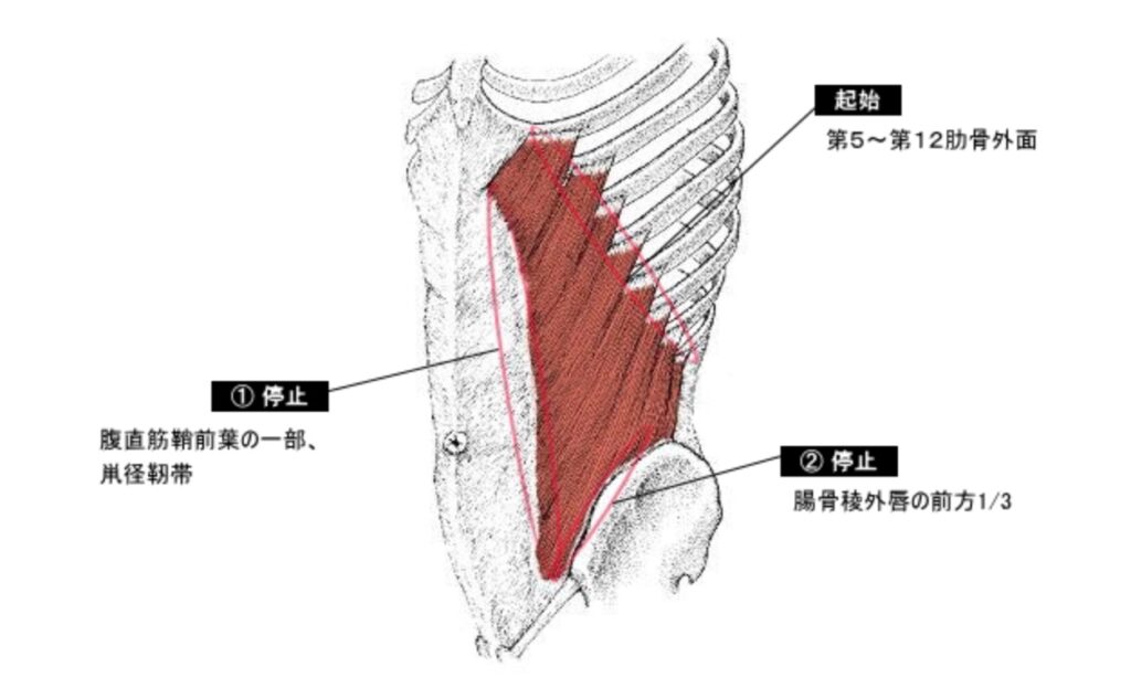 内腹斜筋:骨盤側の腸骨稜や胸腰筋膜から起始し、第10~12肋骨および腹直筋鞘・白線に停止する