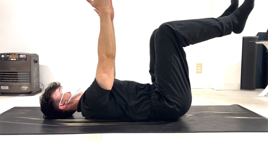 スタート姿勢: 仰向けになり、天井へ向かって前ならえをすように腕をあげます。膝・股関節を90度に曲げて持ち上げます(テーブルトップポジション)。