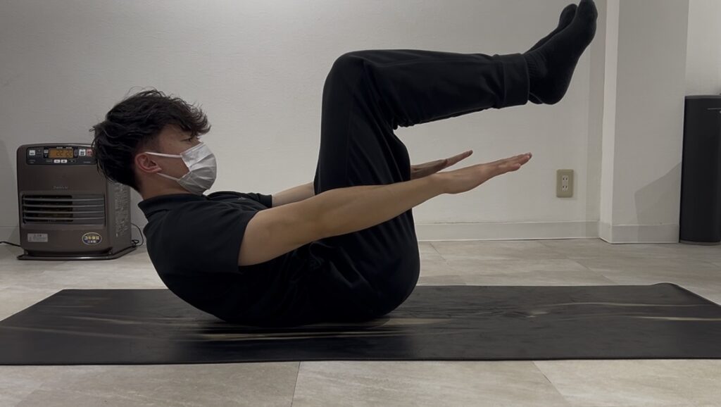 注意点:動作中に腰や背中に隙間ができないようにお腹をを薄くすることを意識し続けます