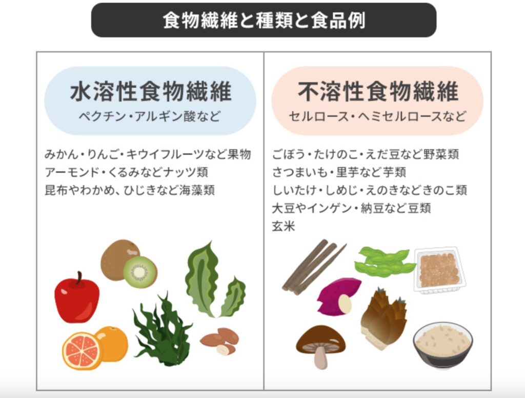 また、食物繊維は大きく2種類に分類することができ、『不溶性食物繊維』と『水溶性食物繊維』の二つに分けることができます。